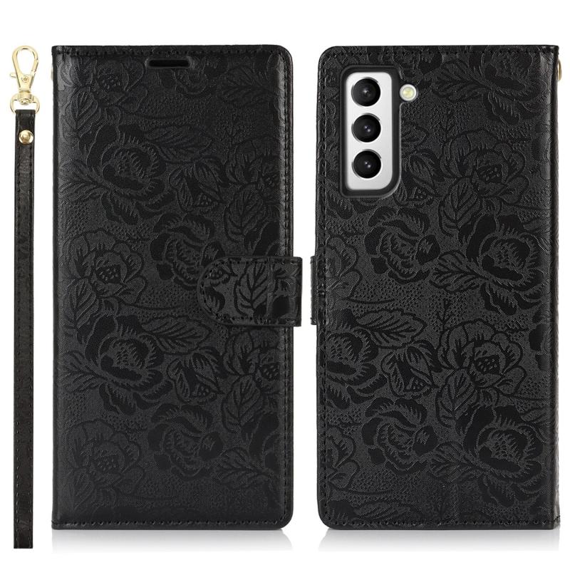 For Samsung Galaxy S21 FE 5G Peony Flowers Imprint Leather Phone Case(Black)