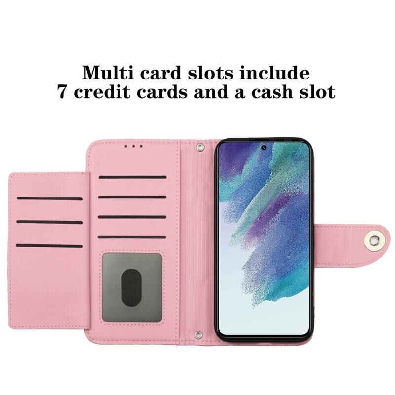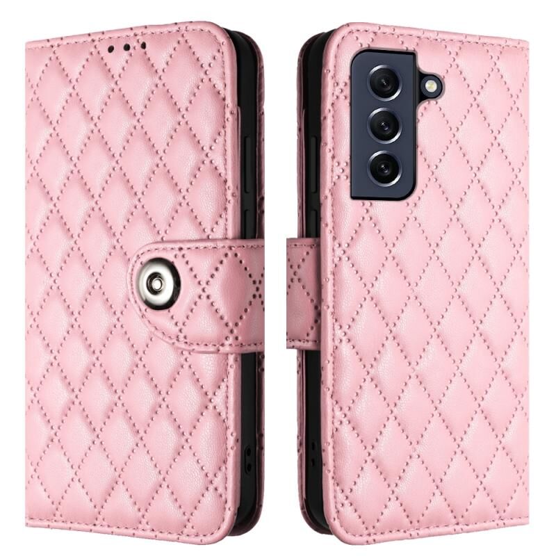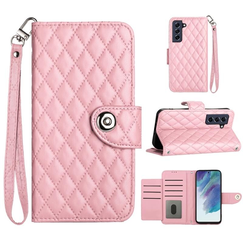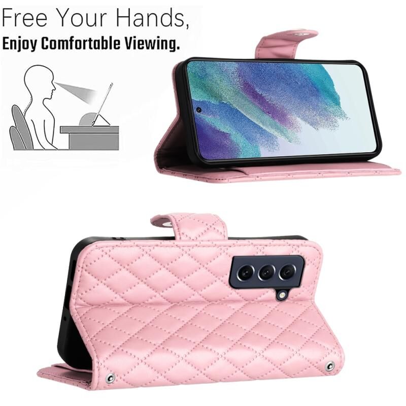 Για Samsung Galaxy S21 FE 5G Rhombic υφή Flip δερμάτινη θήκη τηλεφώνου με κορδόνι (ροζ)