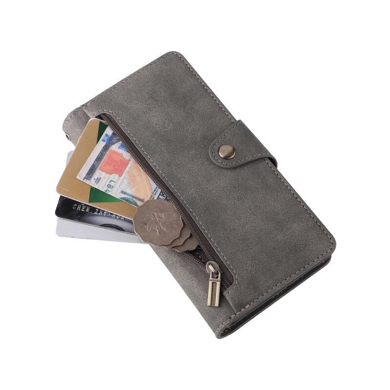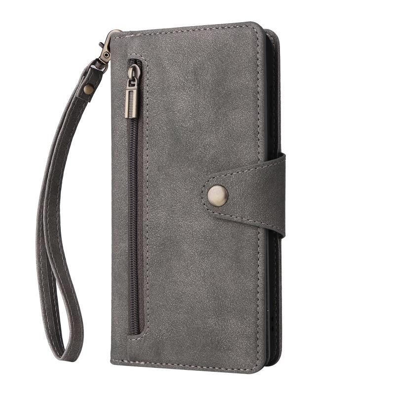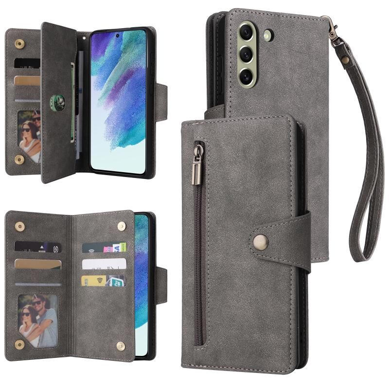 Για Samsung Galaxy S21 FE 5G Rivet πόρπη 9 κάρτες τρεις φορές δερμάτινη θήκη τηλεφώνου (γκρι)