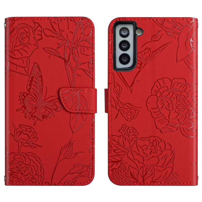 Θήκη τηλεφώνου Samsung Galaxy S21 FE 5G από δέρμα με ανάγλυφο σχέδιο πεταλούδας και παιώνιας (κόκκινο)
