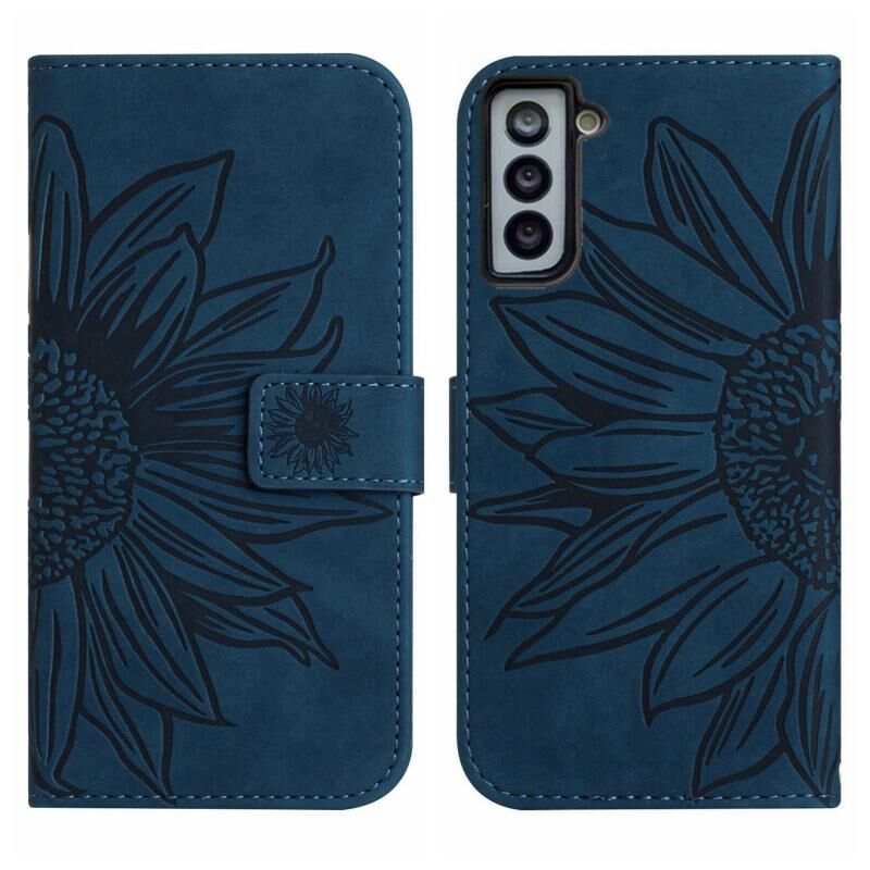 Για το Samsung Galaxy S21 FE 5G δέρμα αίσθηση Sun Flower μοτίβο Flip δέρμα τηλέφωνο υπόθεση με κορδόνι (μπλε)
