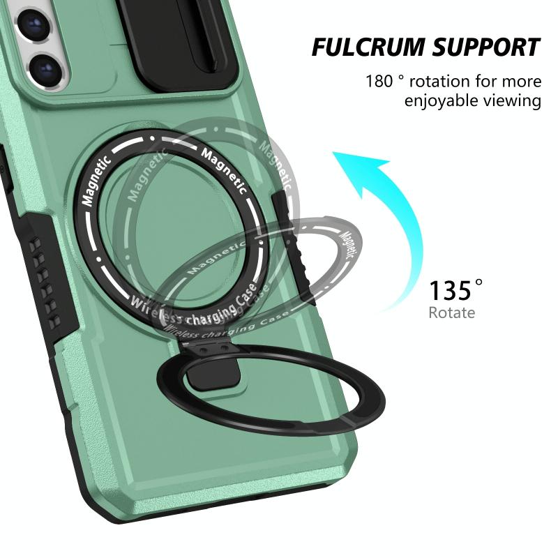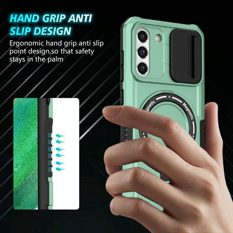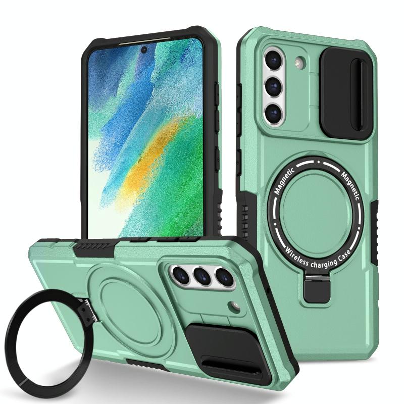 For Samsung Galaxy S21 FE 5G Sliding Camshield Magsafe Holder TPU Hybrid PC Phone Case(Light Blue)