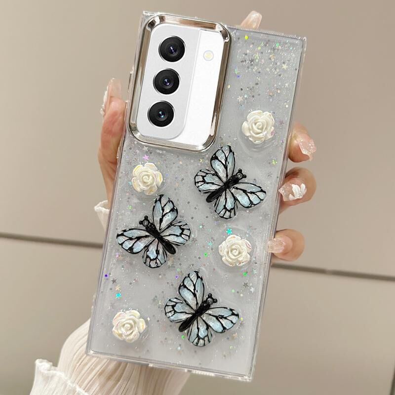 Θήκη τηλεφώνου TPU με τρισδιάστατη πεταλούδα και γκλίτερ για Samsung Galaxy S21 FE 5G (Μπλε)