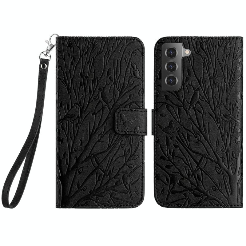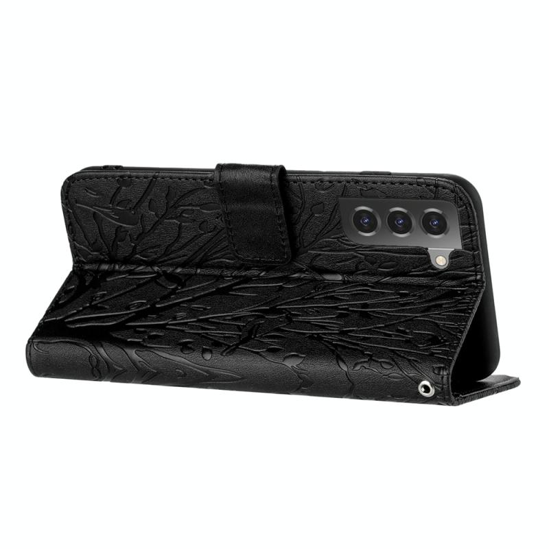 For Samsung Galaxy S21 FE 5G Tree Birds Embossed Pattern Leather Phone Case(Black)