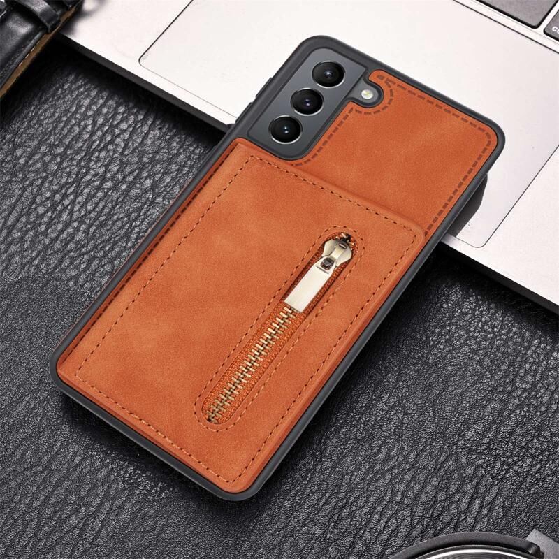 Θήκη κινητού τηλεφώνου με φερμουάρ και θήκη καρτών για Samsung Galaxy S21 FE 5G (Καφέ)