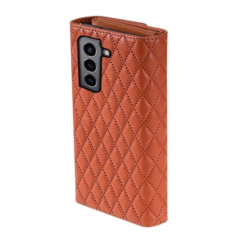 Για Samsung Galaxy S21 FE 5G φερμουάρ πολλαπλών καρτών πορτοφόλι ρομβοειδή δερμάτινη θήκη τηλεφώνου (καφέ)