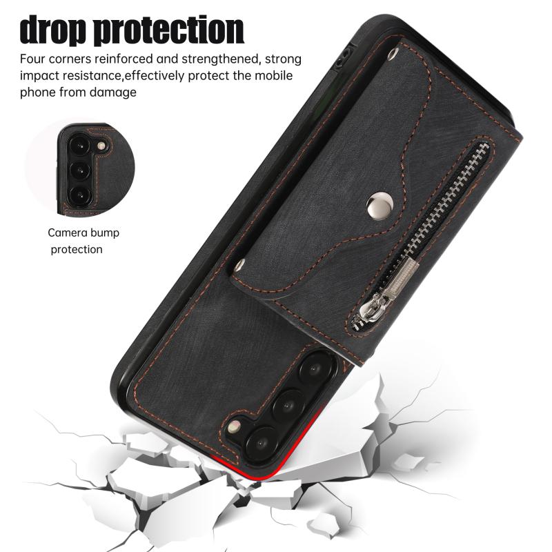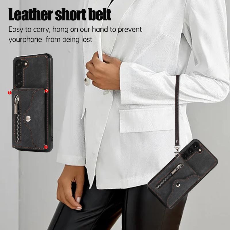 For Samsung Galaxy S21 FE 5G Zipper RFID Card Slots Phone Case with Short Lanyard(Black)