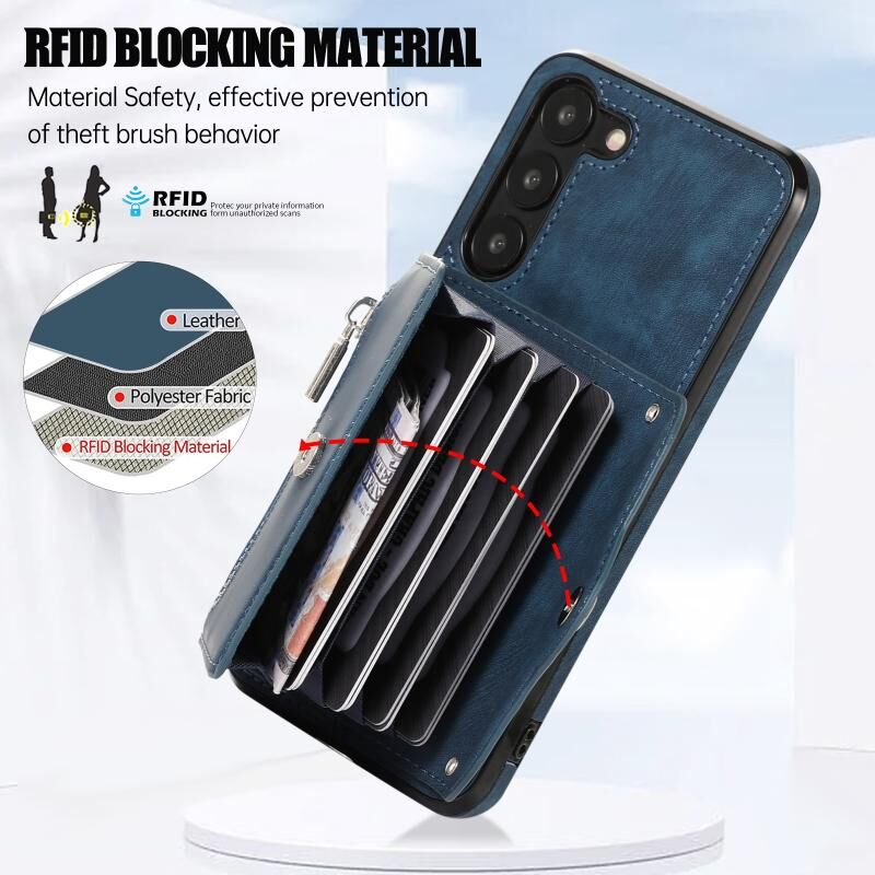 Θήκη κινητού τηλεφώνου με φερμουάρ και θήκες καρτών RFID για Samsung Galaxy S21 FE 5G με κοντό κορδόνι (Χρυσό ροζ)