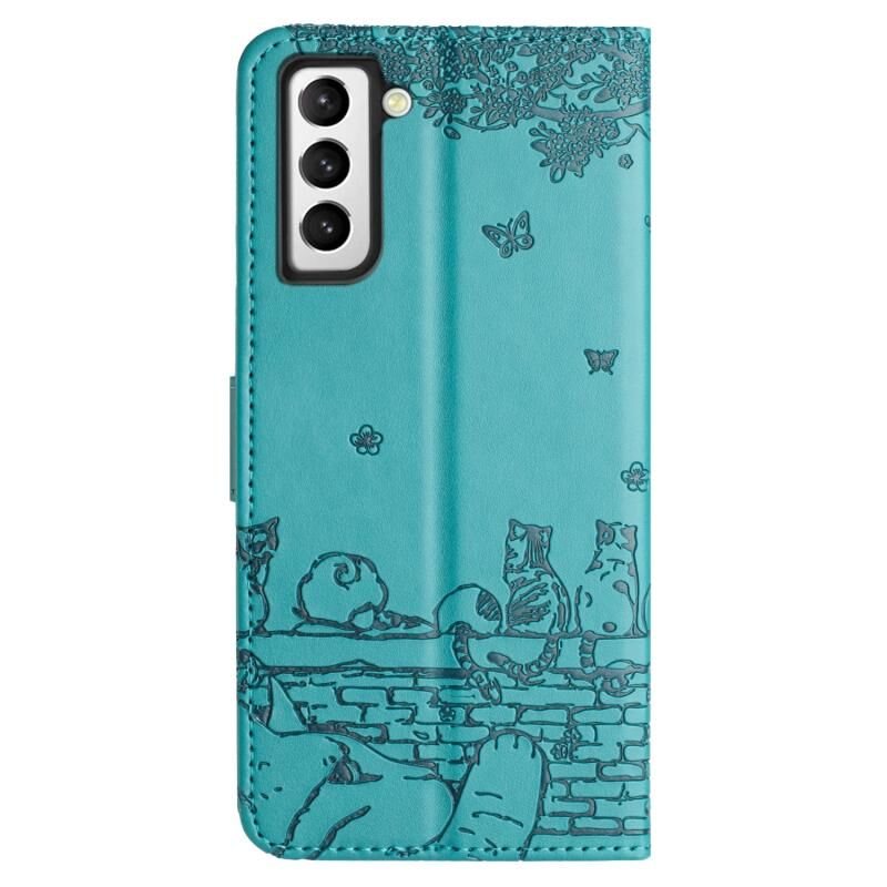 Θήκη κινητού Samsung Galaxy S21 FE με ανάγλυφο σχέδιο γάτας, δερμάτινη με κορδόνι (Μπλε)