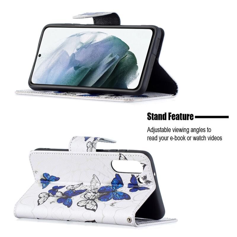 Θήκη δέρματος οριζόντιας αναδίπλωσης με σχέδιο πολύχρωμης ζωγραφικής για Samsung Galaxy S21 FE με βάση & υποδοχές καρτών & πορτοφόλι (Μπλε Πεταλούδες)