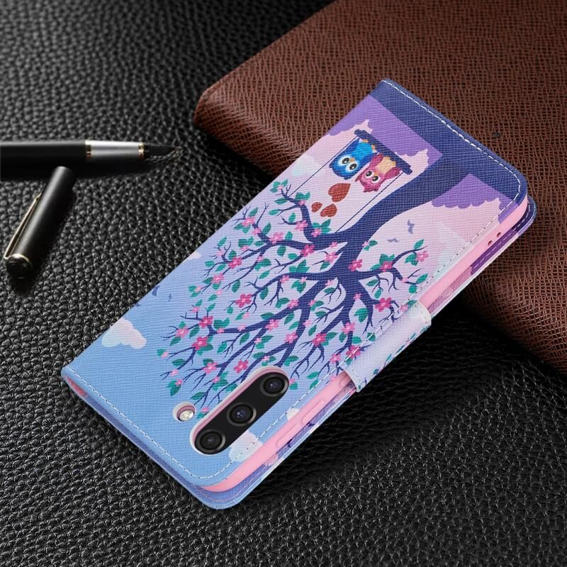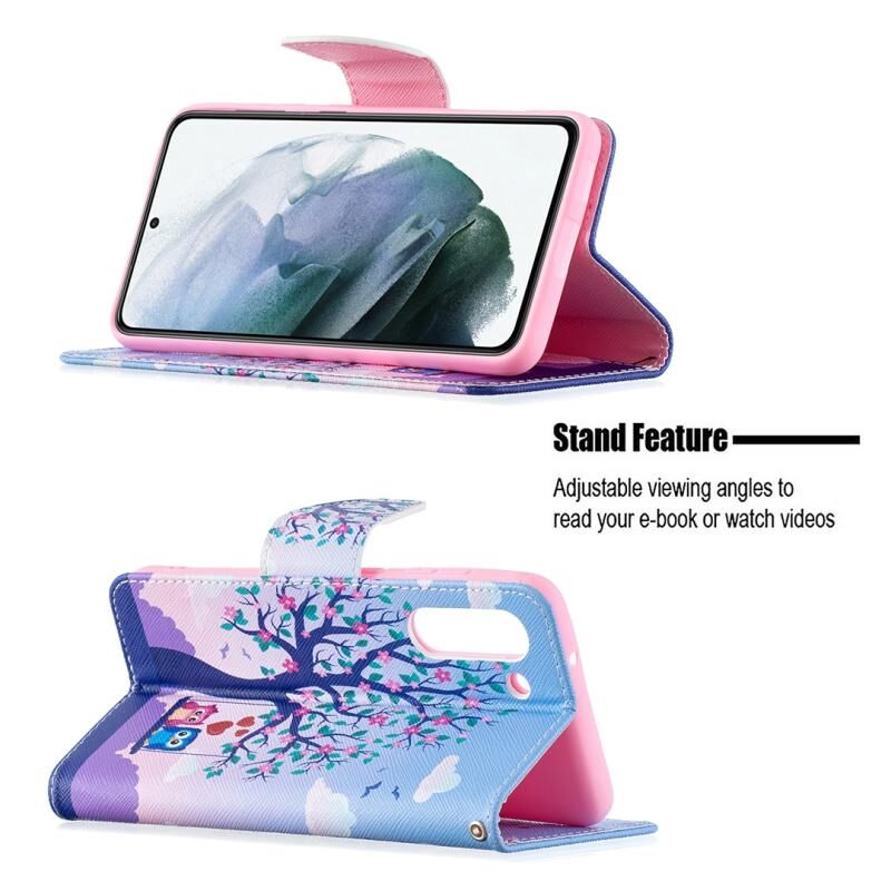 Θήκη δέρματος οριζόντιας αναδίπλωσης με σχέδιο πολύχρωμης ζωγραφικής για Samsung Galaxy S21 FE με βάση & υποδοχές καρτών & πορτοφόλι (Κουκουβάγια)