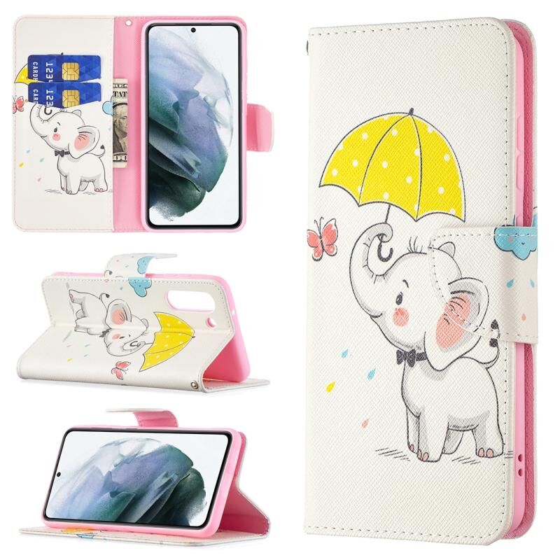 Θήκη δέρματος οριζόντιας αναδίπλωσης με σχέδιο πολύχρωμης ζωγραφικής για Samsung Galaxy S21 FE με βάση στήριξης & υποδοχές καρτών & πορτοφόλι (Ομπρέλα Ελέφαντας)