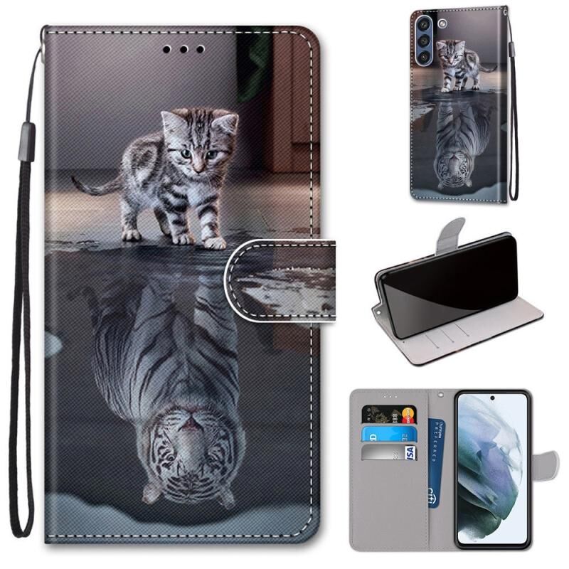 Θήκη για Samsung Galaxy S21 FE με πολύχρωμο σχέδιο, υφή διασταυρούμενης υφής, οριζόντια, από δερματίνη PU με βάση & θήκες για κάρτες & πορτοφόλι & κορδόνι (Η γάτα γίνεται τίγρης)