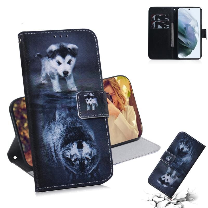 Θήκη δέρματος οριζόντιας αναδίπλωσης με σχέδιο (Λύκος και Σκύλος) για Samsung Galaxy S21 FE, με βάση στήριξης & υποδοχές καρτών & πορτοφόλι.