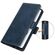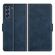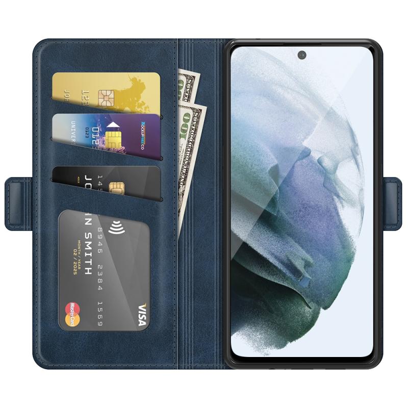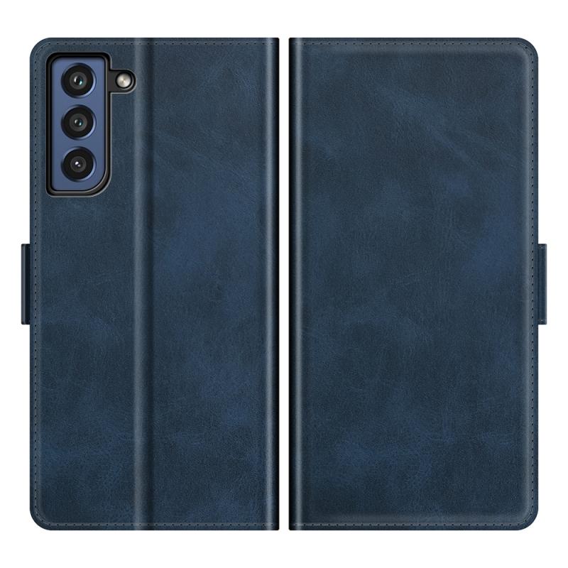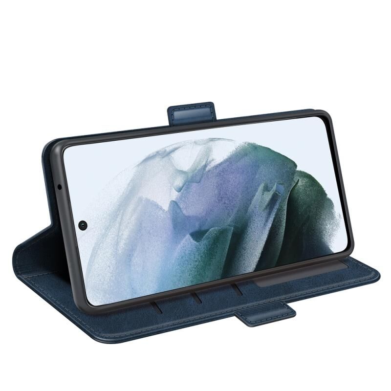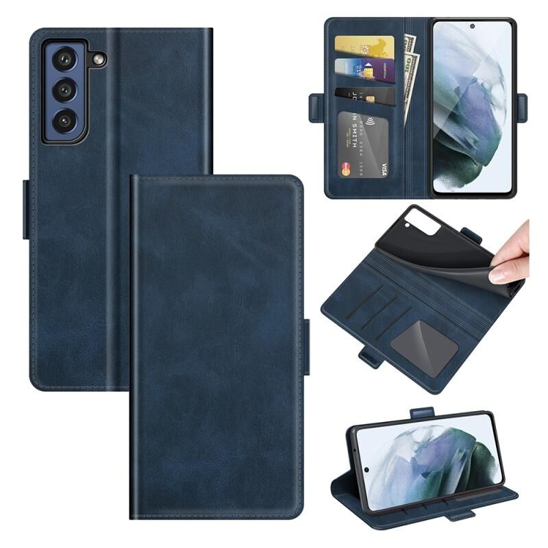 Θήκη δέρματος οριζόντιας αναδίπλωσης με μαγνητικό κούμπωμα διπλής όψης για Samsung Galaxy S21 FE με βάση στήριξης & υποδοχές καρτών & πορτοφόλι (Σκούρο μπλε)