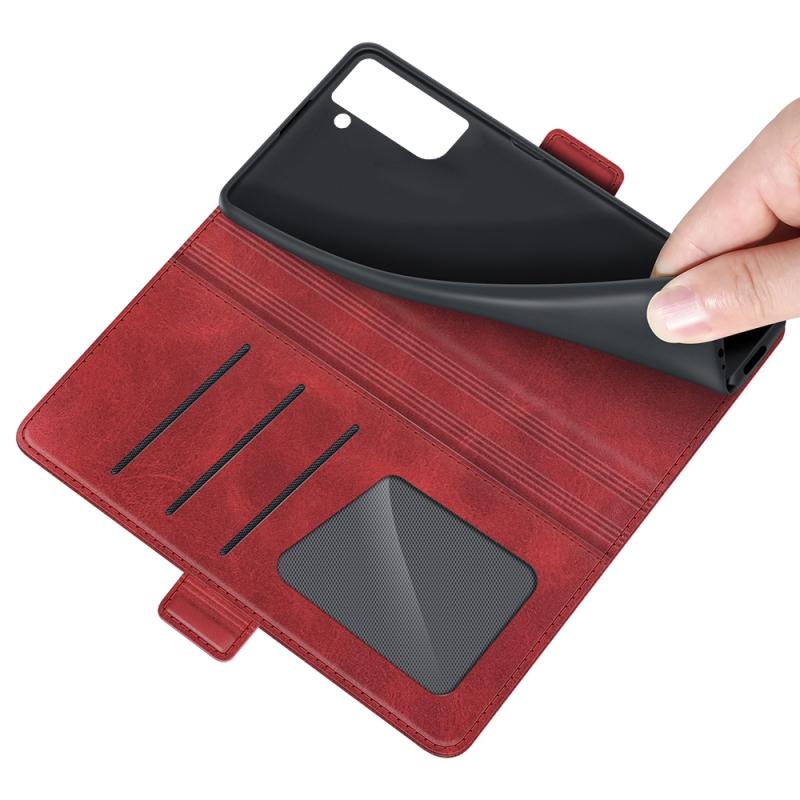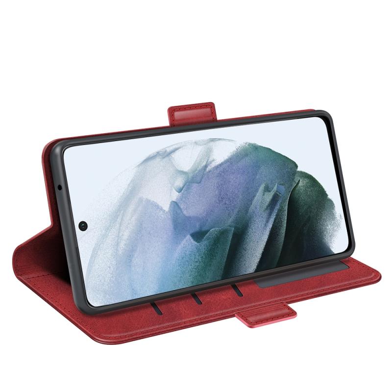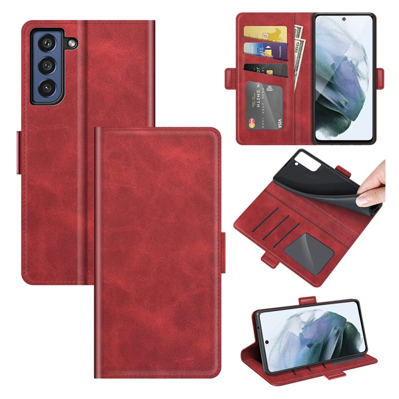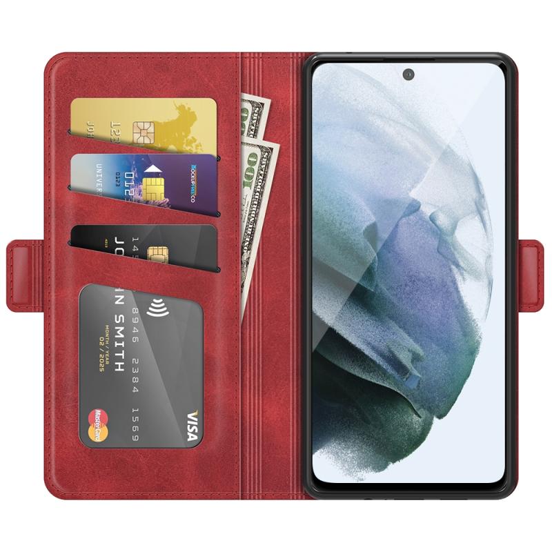 Θήκη δέρματος οριζόντιας αναδίπλωσης με μαγνητικό κούμπωμα διπλής όψης για Samsung Galaxy S21 FE με βάση στήριξης & υποδοχές καρτών & πορτοφόλι (Κόκκινο)