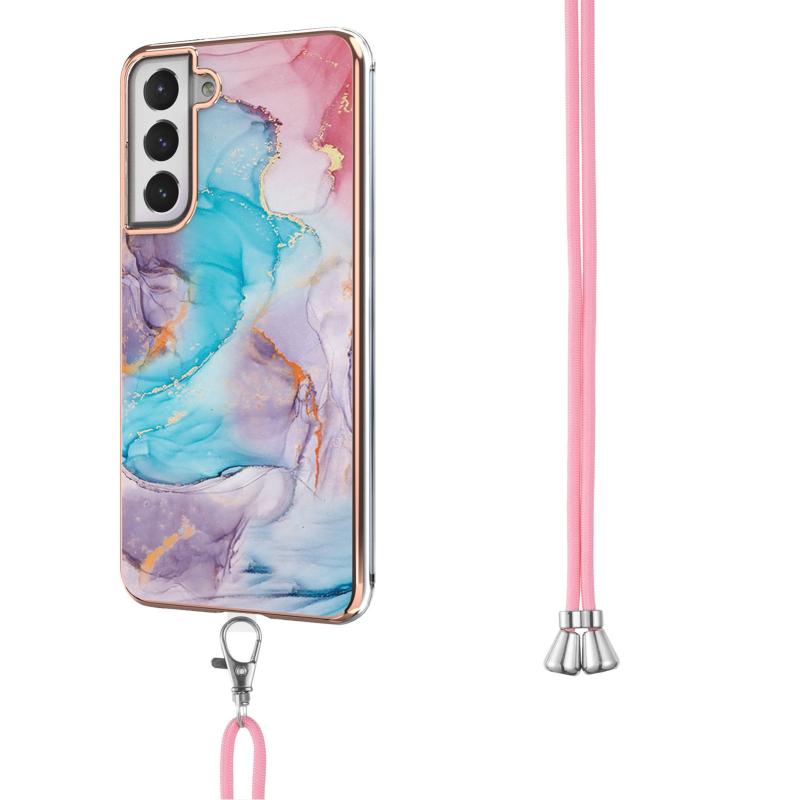 Θήκη για Samsung Galaxy S21 FE με σχέδιο επιμετάλλωσης IMD, αντικραδασμική από TPU με λουρί λαιμού (Μωβ Λουλούδι)