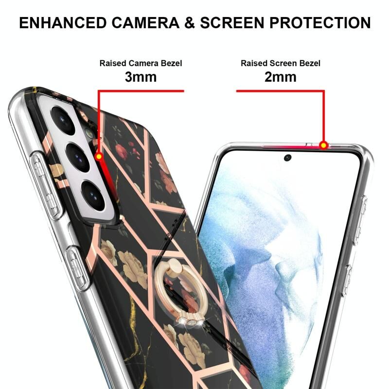 Θήκη για Samsung Galaxy S21 FE με ηλεκτρολυτική επιμετάλλωση, συνδυασμό μαρμάρου και λουλουδιών, από TPU με αντικραδασμική προστασία και δαχτυλίδι στήριξης με ρητίνες (Ροζ Λουλούδι)