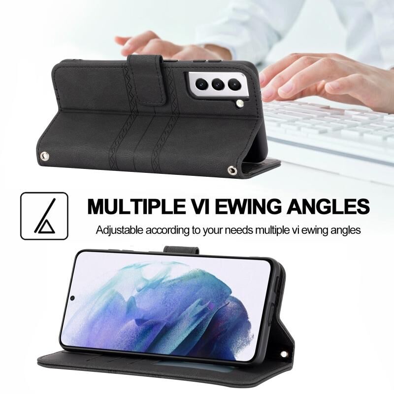 Για Samsung Galaxy S21 FE ανάγλυφη ριγέ μαγνητική πόρπη PU + TPU οριζόντια Flip δερμάτινη θήκη με θήκη & υποδοχή κάρτας & πορτοφόλι & κορνίζα φωτογραφιών & σφεντόνα (Μαύρο)