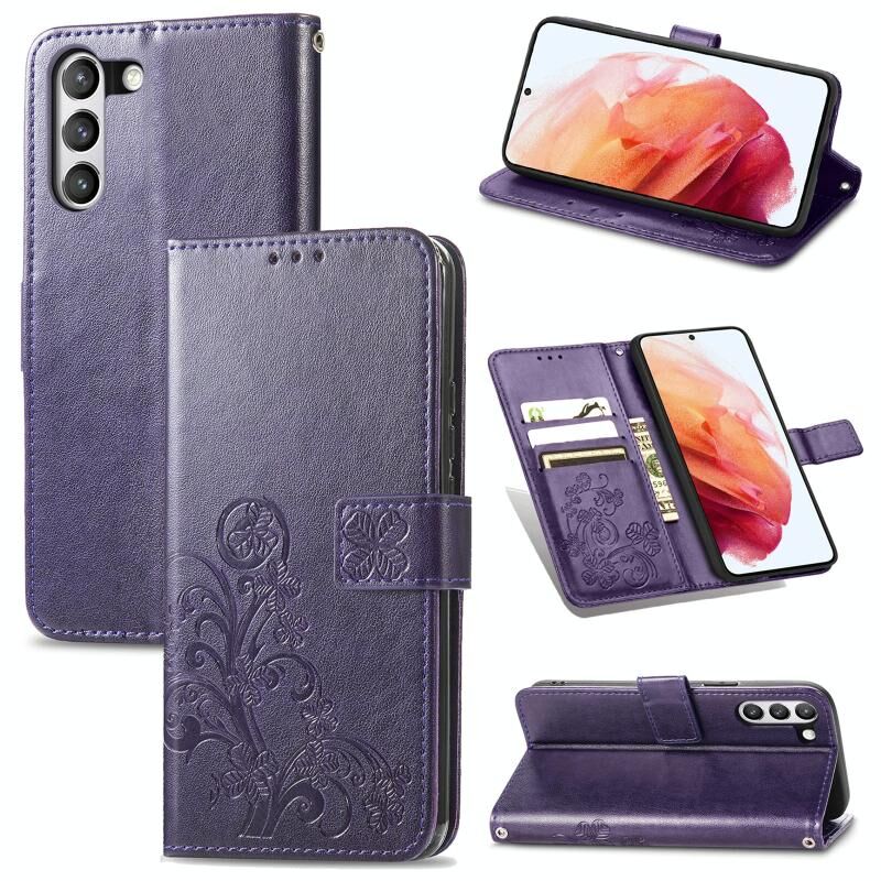 Για Samsung Galaxy S21 FE Four-leaf Clasp ανάγλυφη αγκράφα Κινητό τηλέφωνο προστασία δερμάτινη θήκη με κορδόνι & υποδοχή για κάρτες & πορτοφόλι & βραχίονα λειτουργία (μωβ)
