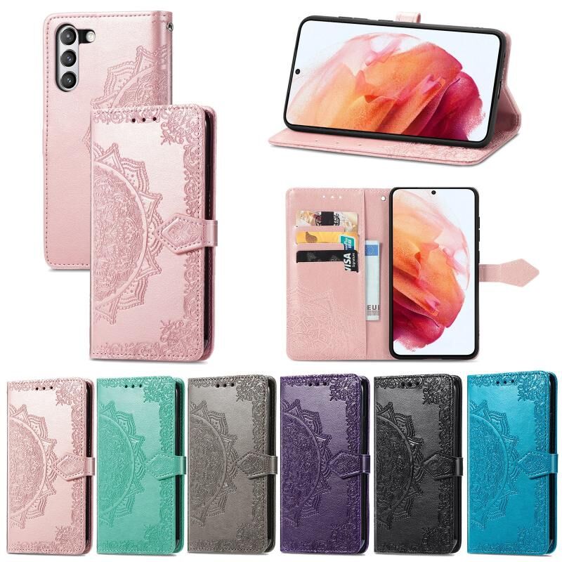 Για Samsung Galaxy S21 FE Halfway Mandala ανάγλυφο μοτίβο οριζόντια Flip δερμάτινη θήκη με θήκη & υποδοχές για κάρτες & πορτοφόλι & κορδόνι (Μαύρο)