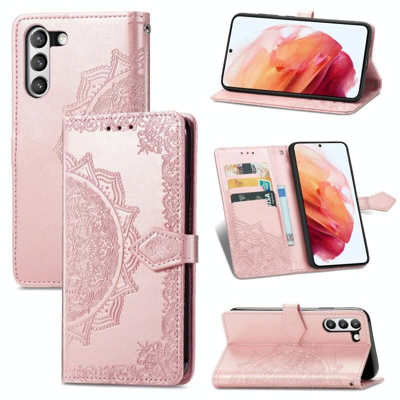 Για Samsung Galaxy S21 FE Halfway Mandala ανάγλυφο μοτίβο οριζόντια Flip δερμάτινη θήκη με θήκη & υποδοχές για κάρτες & πορτοφόλι & κορδόνι (Ροζ χρυσός)
