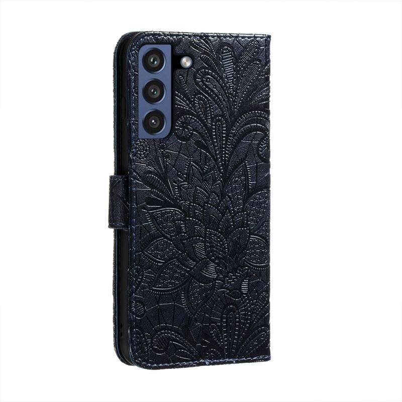 Για Samsung Galaxy S21 FE Lace λουλούδι ανάγλυφο μοτίβο οριζόντια Flip δερμάτινη θήκη με θήκη & υποδοχές για κάρτες & πορτοφόλι & κορνίζα φωτογραφιών (Σκούρο μπλε)