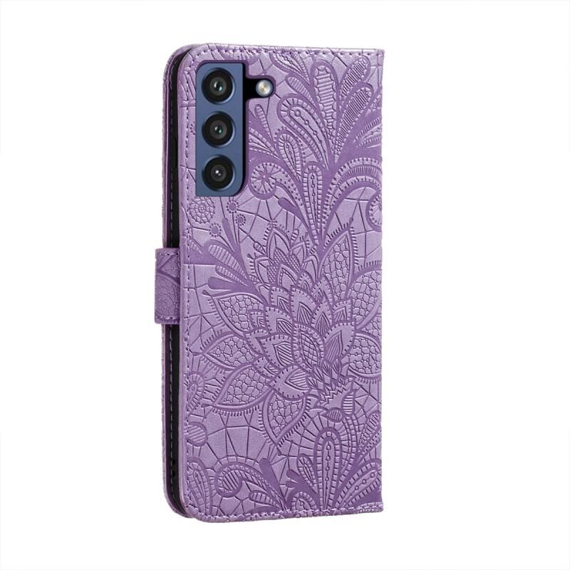 Για Samsung Galaxy S21 FE Lace λουλούδι ανάγλυφο μοτίβο οριζόντια Flip δερμάτινη θήκη με θήκη & υποδοχές για κάρτες & πορτοφόλι & κορνίζα φωτογραφιών (Μωβ)