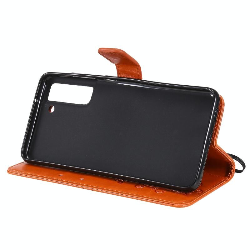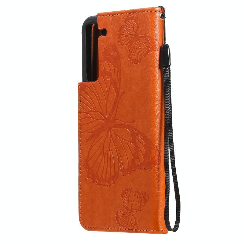 Για Samsung Galaxy S21 FE Πιεσμένη εκτύπωση πεταλούδα μοτίβο οριζόντια Flip PU δέρμα υπόθεση με θήκη & υποδοχές για κάρτες & πορτοφόλι & κορδόνι (Πορτοκαλί)