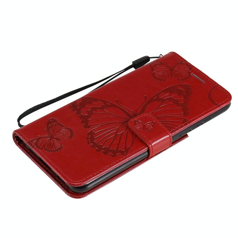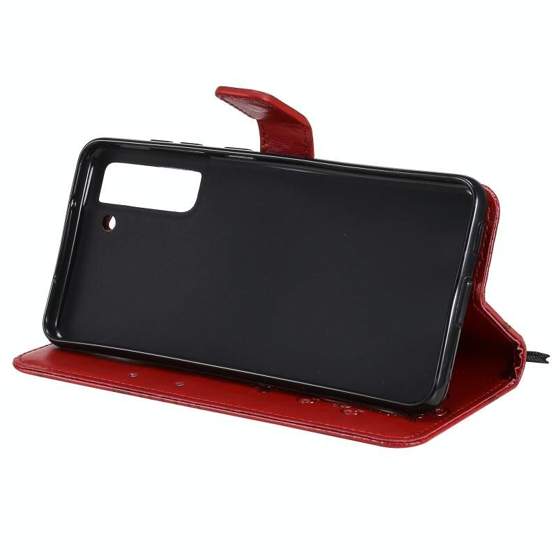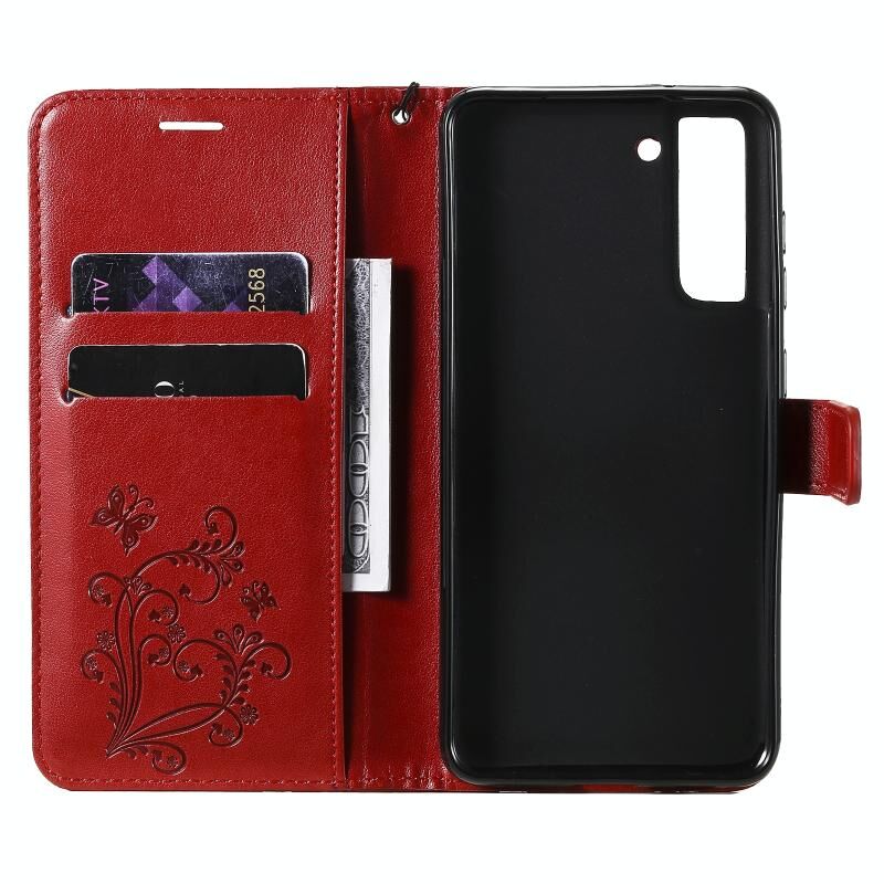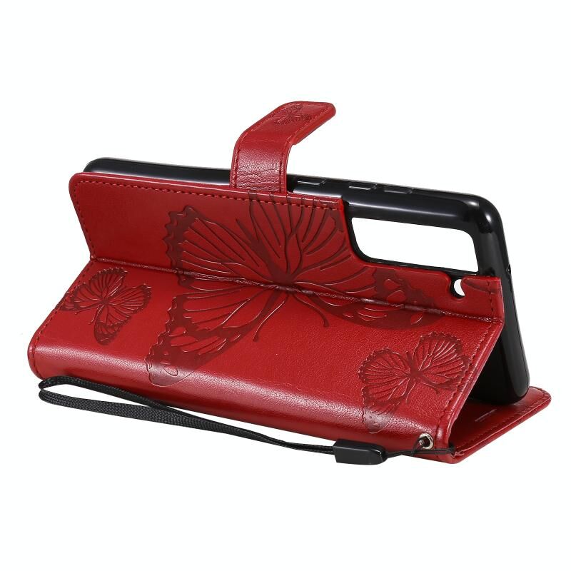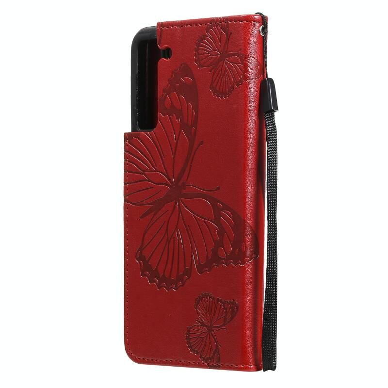 Για Samsung Galaxy S21 FE Πιεστική εκτύπωση πεταλούδα μοτίβο οριζόντια Flip PU δέρμα υπόθεση με θήκη & υποδοχές για κάρτες & πορτοφόλι & κορδόνι (Κόκκινο)