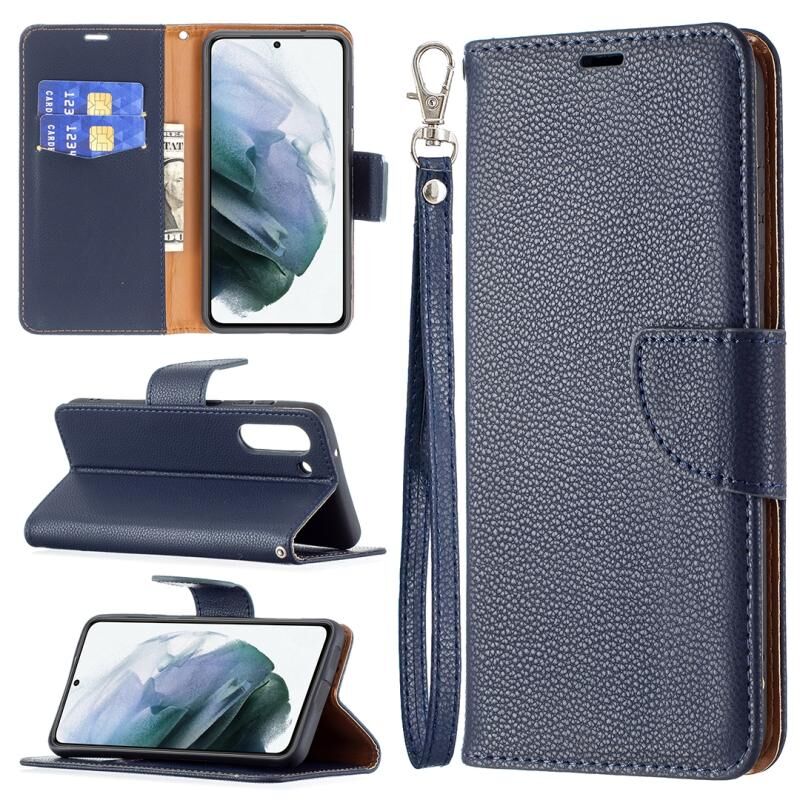 Για Samsung Galaxy S21 FE / S21 Lite Litchi Υφή καθαρό χρώμα οριζόντια Flip δερμάτινη θήκη με θήκη & υποδοχές για κάρτες & πορτοφόλι & κορδόνι (σκούρο μπλε)