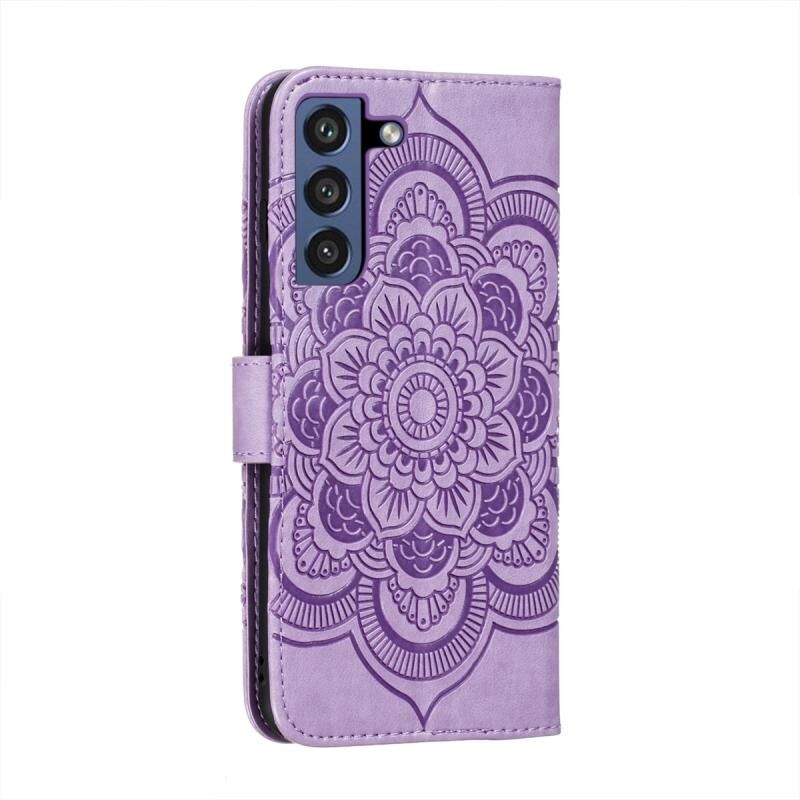 Για Samsung Galaxy S21 FE Sun Mandala ανάγλυφο μοτίβο οριζόντια Flip PU δερμάτινη θήκη με θήκη & υποδοχές για κάρτες & πορτοφόλι & κορδόνι (μωβ)
