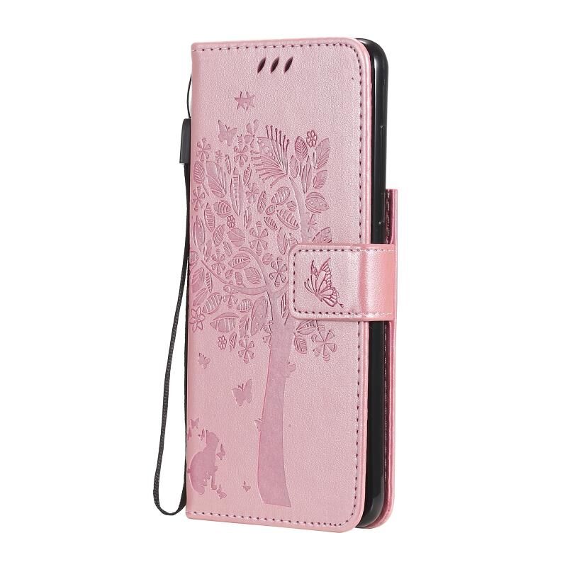 Θήκη Samsung Galaxy S21 FE με σχέδιο Δέντρου & Γάτας, εκτύπωση με πίεση, οριζόντια, από δερματίνη PU με βάση στήριξης, θήκες καρτών, πορτοφόλι & κορδόνι (Ροζ χρυσός)