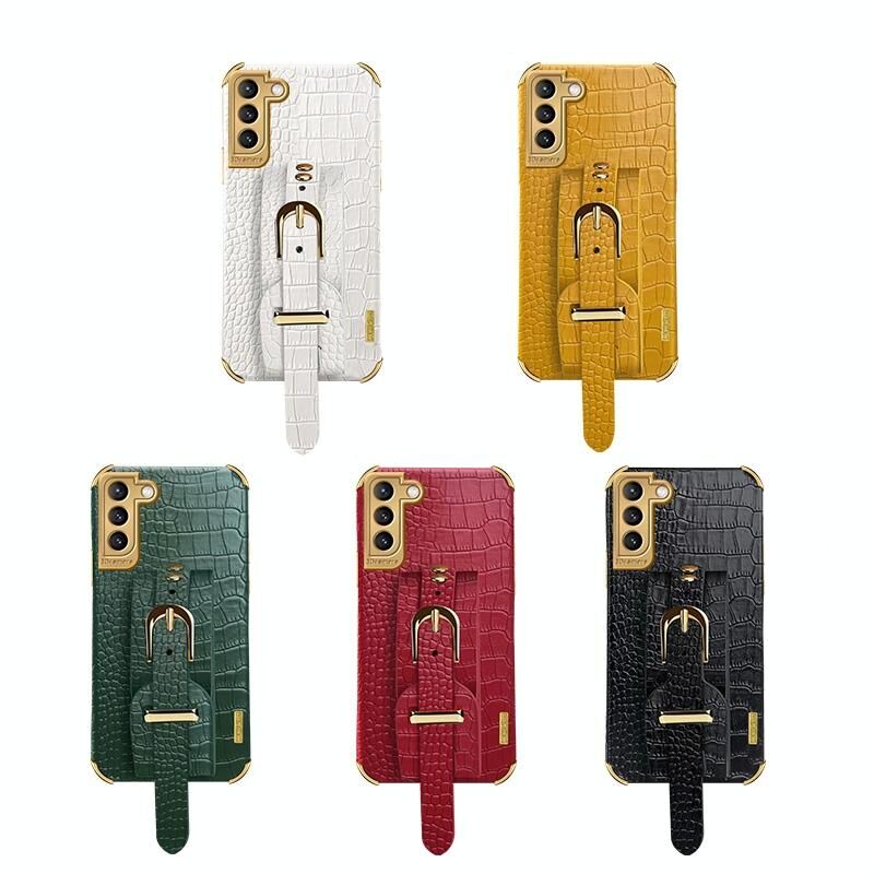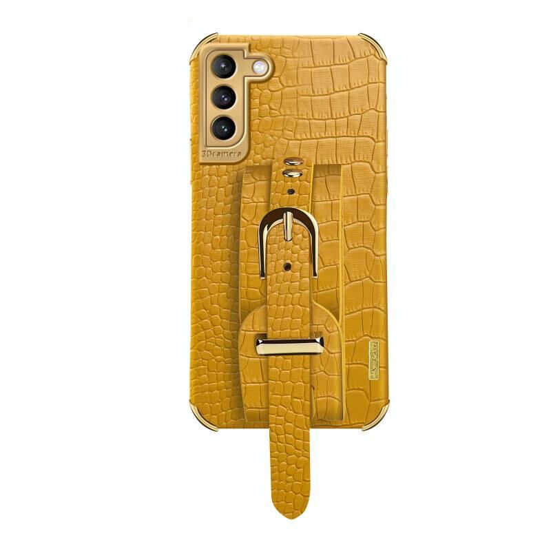 Για Samsung Galaxy S21 Plus Electroplated TPU Crocodile Pattern Leather Case με λουράκι καρπού (Κίτρινο)