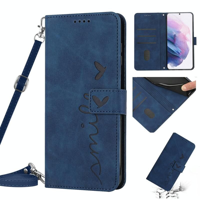 Για Samsung Galaxy S21 + δέρμα αισθάνονται καρδιά μοτίβο δερμάτινη θήκη τηλεφώνου με κορδόνι (μπλε)