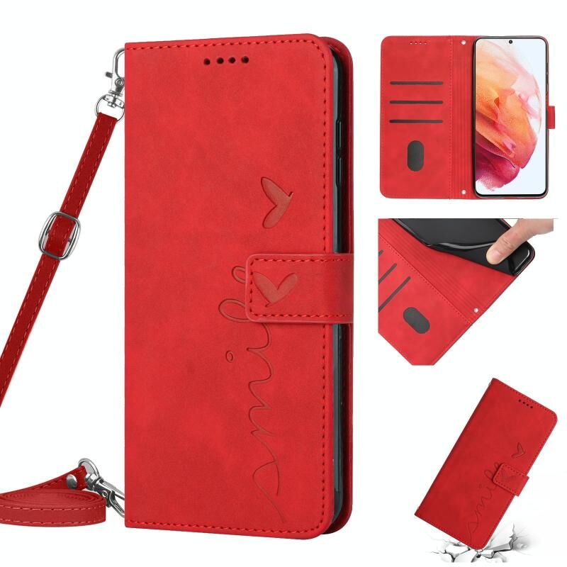 Για Samsung Galaxy S21 δέρμα αίσθηση καρδιά μοτίβο δερμάτινη θήκη τηλεφώνου με κορδόνι (κόκκινο)