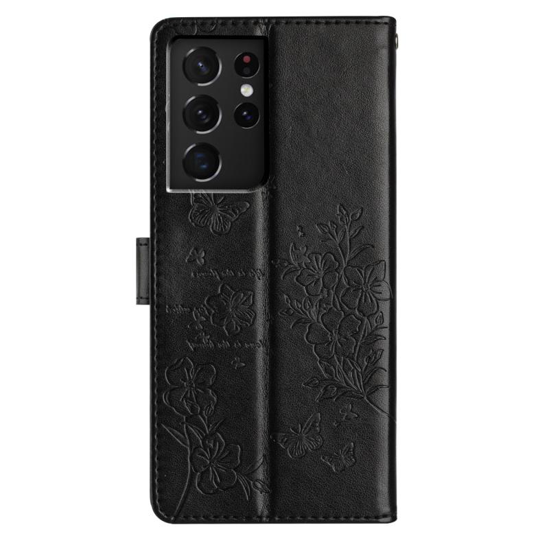 For Samsung Galaxy S21 Ultra 5G Butterflies and Flowers Leather Phone Case(Black)