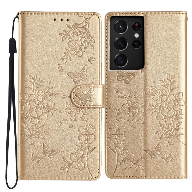 For Samsung Galaxy S21 Ultra 5G Butterflies and Flowers Leather Phone Case(Gold)