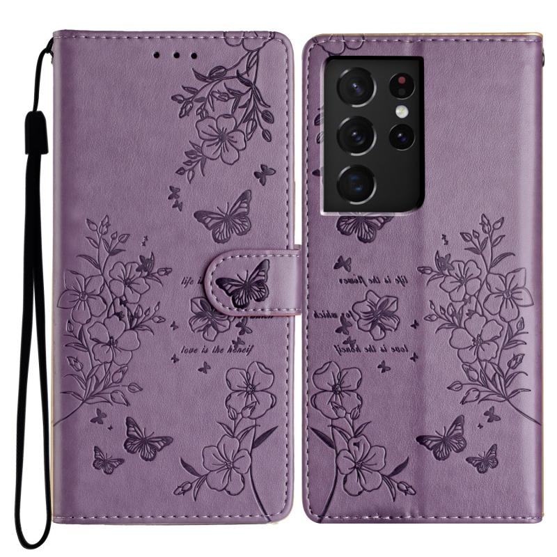 For Samsung Galaxy S21 Ultra 5G Butterflies and Flowers Leather Phone Case(Purple)