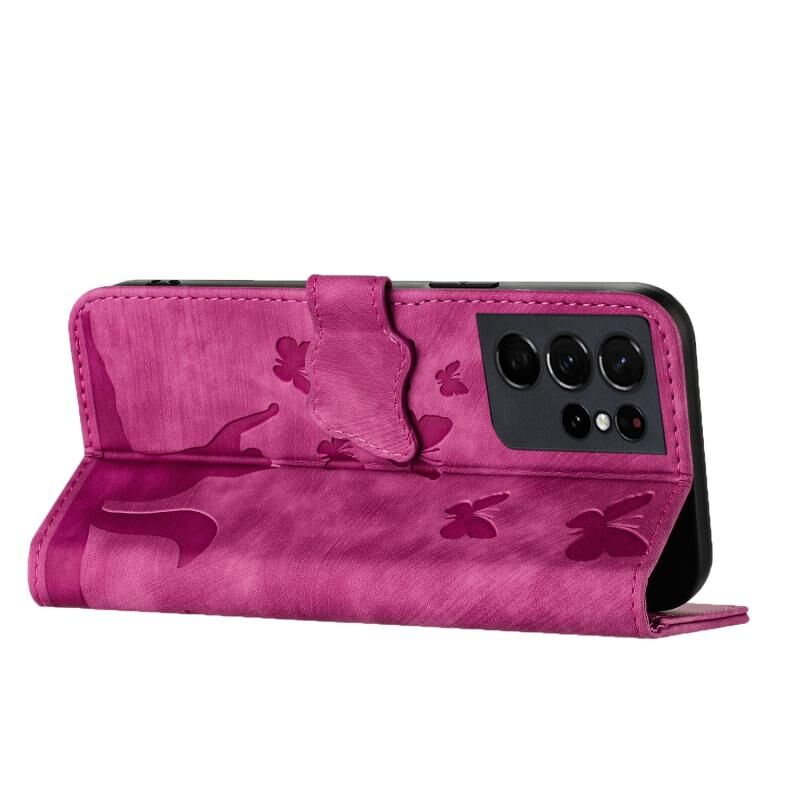 Θήκη τηλεφώνου Samsung Galaxy S21 Ultra 5G, δερμάτινη, τύπου flip, με ανάγλυφο σχέδιο πεταλούδας και γάτας (Μωβ)