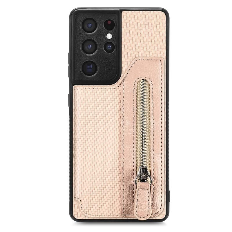 Για Samsung Galaxy S21 Ultra 5G Carbon Fiber Οριζόντια Flip φερμουάρ πορτοφόλι τηλέφωνο υπόθεση (χακί)