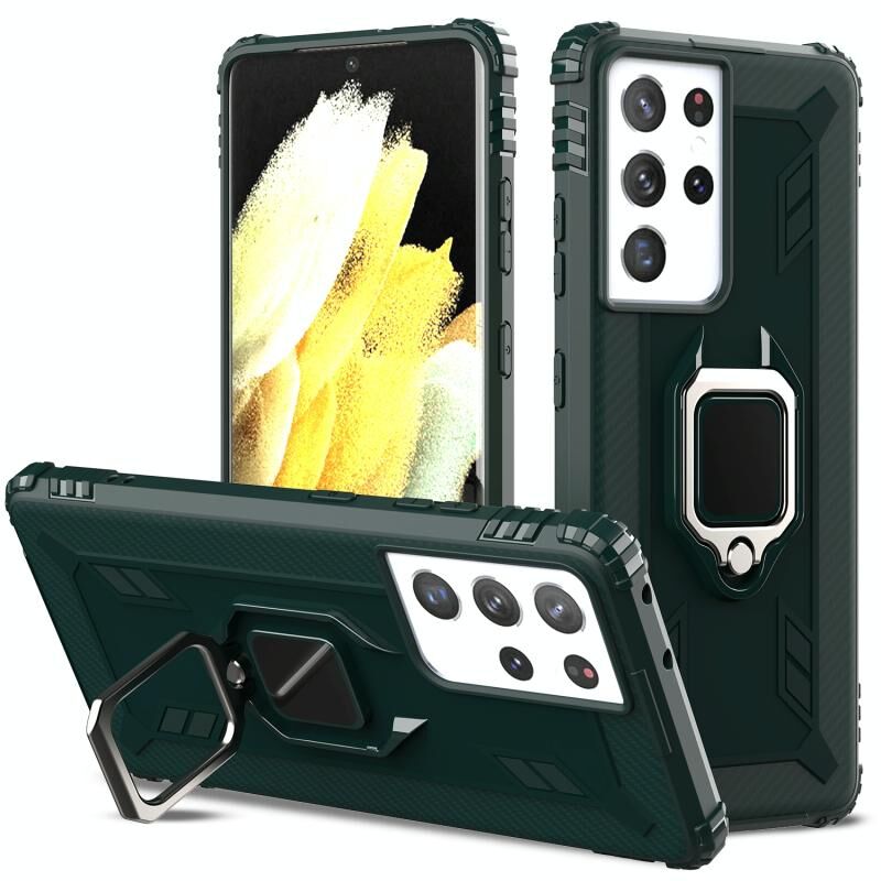 Για Samsung Galaxy S21 Ultra 5G Carbon Fiber προστατευτική θήκη με 360 μοίρες περιστρεφόμενο δαχτυλίδι κάτοχος (πράσινο)