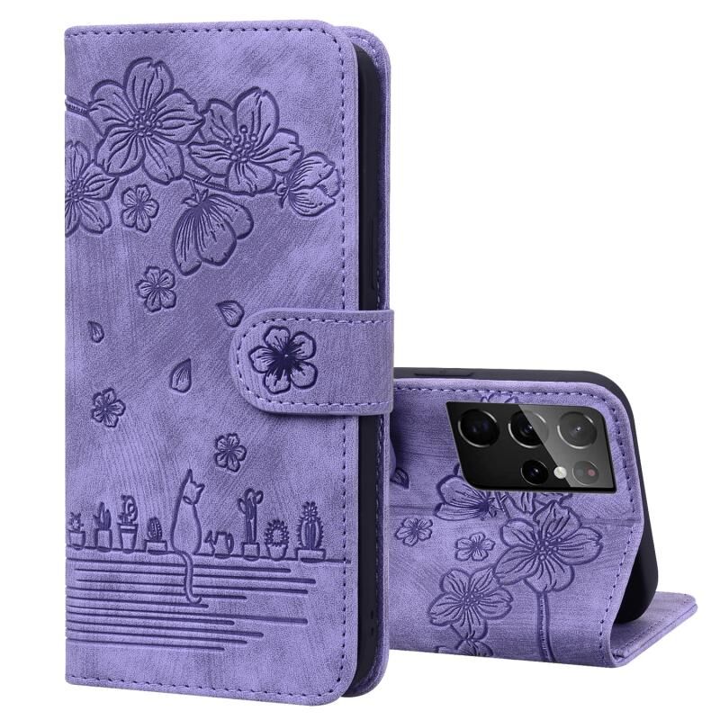 Θήκη τηλεφώνου από δέρμα με ανάγλυφο σχέδιο καρτούν Sakura Cat για Samsung Galaxy S21 Ultra 5G (Κόκκινο Ρόδο)