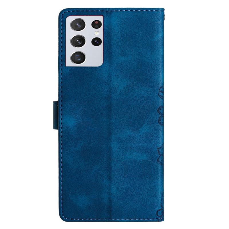 For Samsung Galaxy S21 Ultra 5G Cherry Blossom Butterfly Skin Feel Embossed PU Phone Case(Blue)