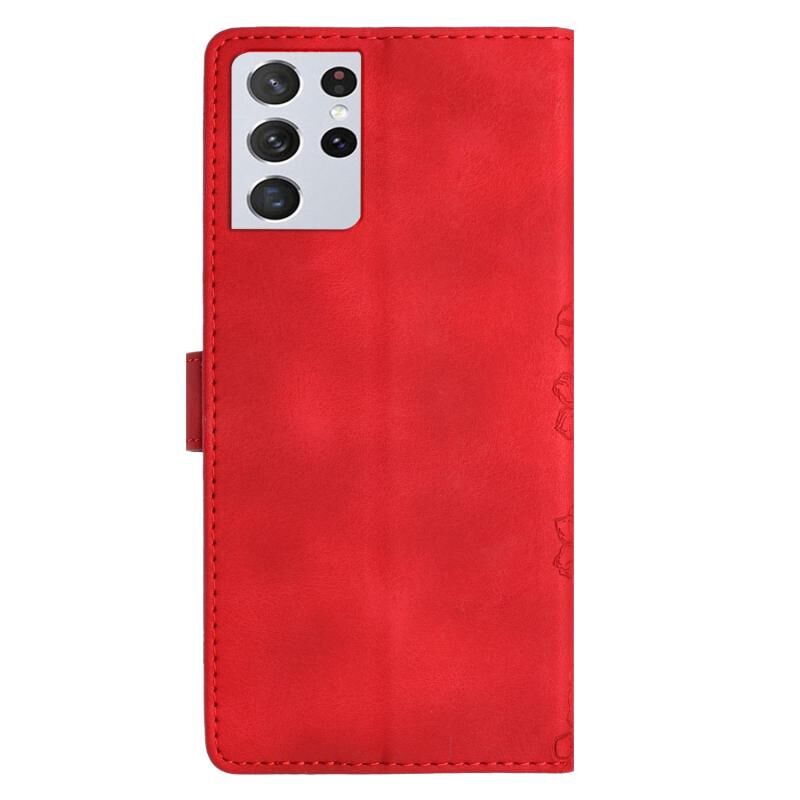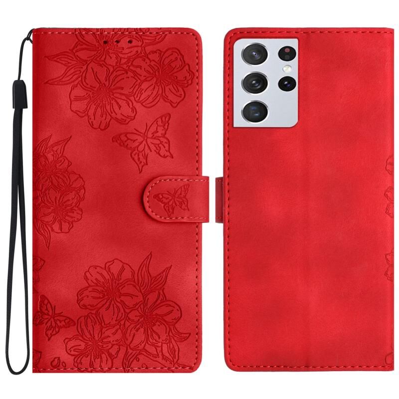 Θήκη τηλεφώνου Samsung Galaxy S21 Ultra 5G Cherry Blossom Butterfly με ανάγλυφο PU υφή δέρματος (Κόκκινο)