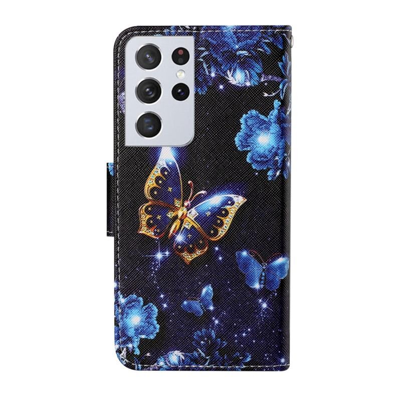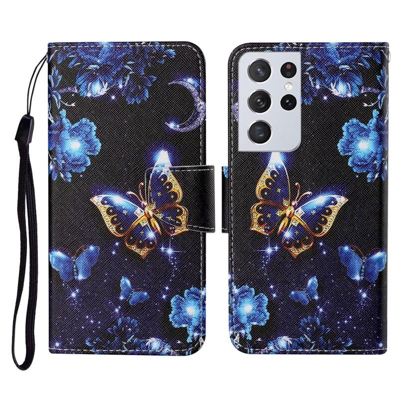 Θήκη δέρματος οριζόντιας αναδίπλωσης με σχέδιο πολύχρωμης ζωγραφικής για Samsung Galaxy S21 Ultra 5G με βάση στήριξης & υποδοχές καρτών & πορτοφόλι & κορδόνι (Πεταλούδα Σελήνης)