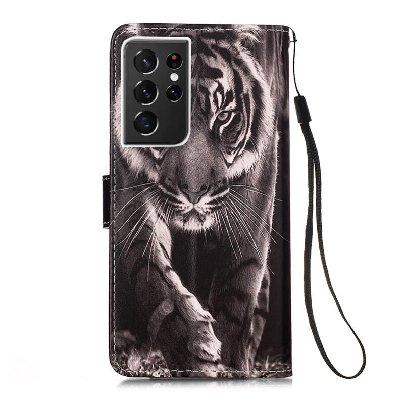 Θήκη δέρματος οριζόντιας αναδίπλωσης για Samsung Galaxy S21 Ultra 5G με σχέδιο πολύχρωμης ζωγραφικής, απλή ύφανση, με βάση & υποδοχή κάρτας & πορτοφόλι & κορδόνι (Τίγρης σε Μαύρο και Λευκό)