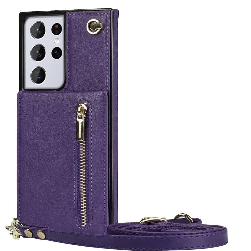 Για Samsung Galaxy S21 Ultra 5G Cross-body φερμουάρ τετράγωνο TPU + PU πίσω κάλυμμα υπόθεση με θήκη & υποδοχές για κάρτες & πορτοφόλι & λουράκι (μωβ)