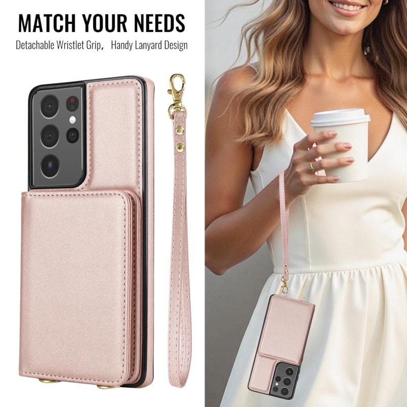 For Samsung Galaxy S21 Ultra 5G Crossbody Dual-buckle Wallet RFID Back Leather Phone Case(Rose Gold)