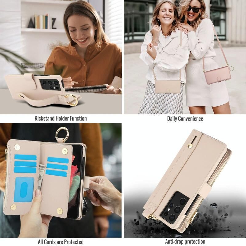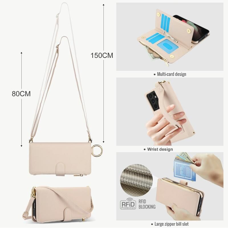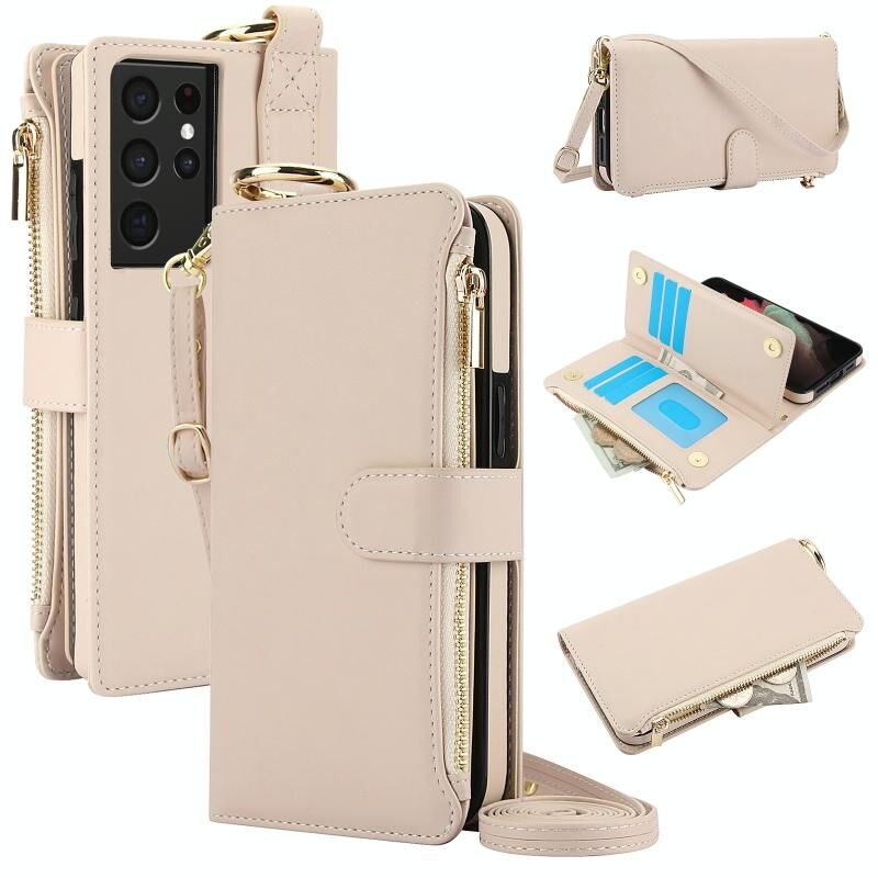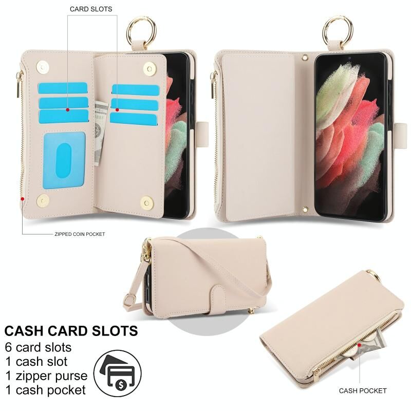 Για Samsung Galaxy S21 Ultra 5G Δαχτυλίδι Crossbody Πολυλειτουργικό πορτοφόλι Δερμάτινη θήκη τηλεφώνου (Λευκό)